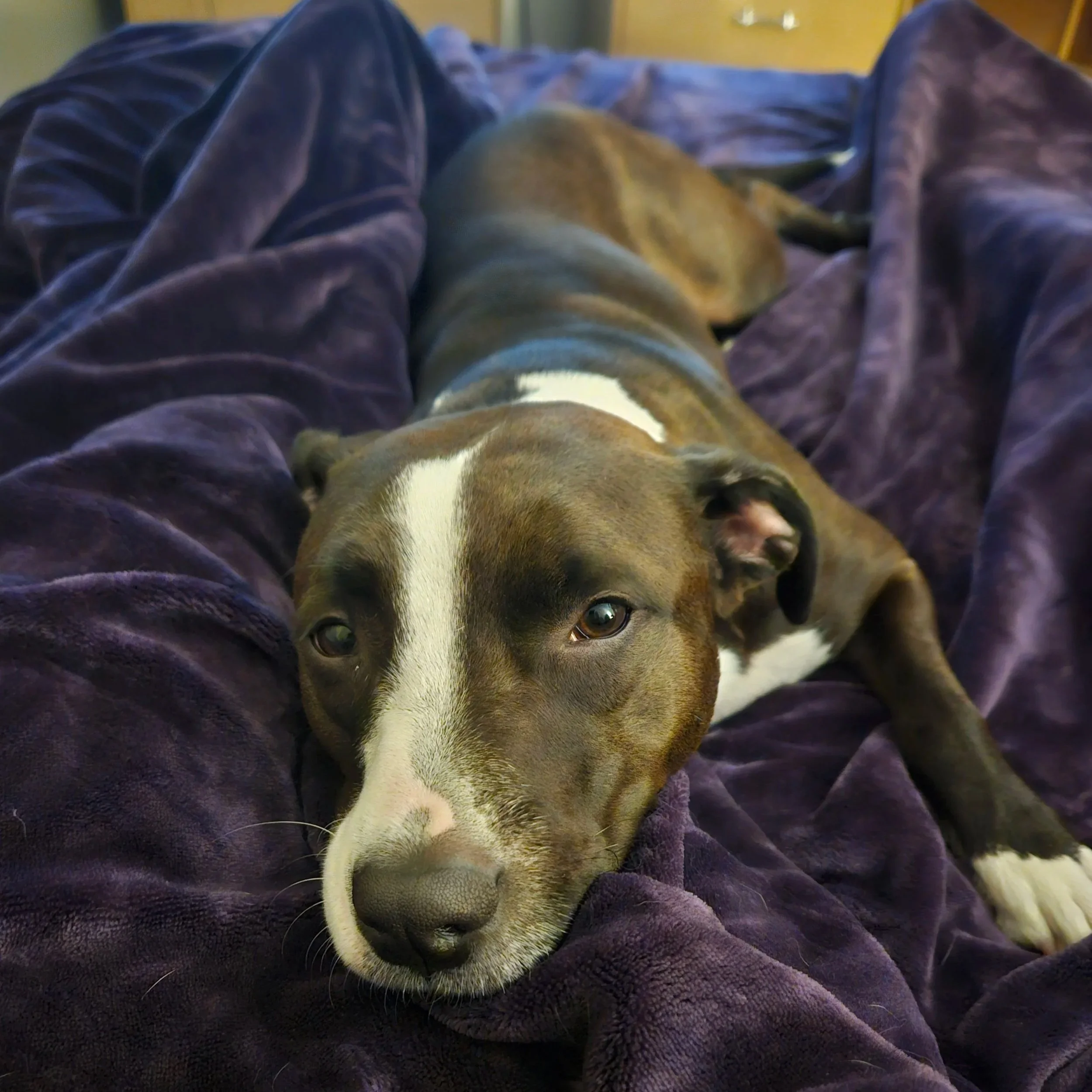 River is a very sweet but nervous medium-sized dark brown dog with slick short fur and white socks. She doesn’t know what to do with herself when she can’t greet new dogs immediately, and she is uncomfortable with strangers, and with people who ignore her when she asks for space. She’s familiar with me, and typically will take treats from me or hang out nearby, but doesn’t want me to pet her, no matter how cuddly she is with her family.