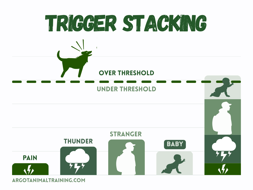 Trigger stacking is when there are multiple stressors in a short period of time, and it can lead to your dog having what seems like a big reaction to something relatively minor… because they aren’t just reacting to the stress of the most recent thing, but to the collective stress of Every Stressful Thing that happened recently.